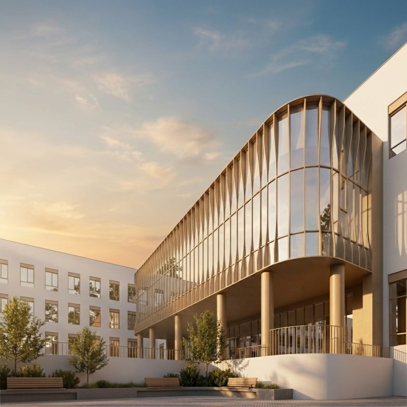 Здание возведут на уникальном участке местности с перепадом высоты 23 метра. Из-за этого постройка получится разноуровневой: она будет состоять их трёх основных блоков, расположенных каскадом со смещением высоты на половину этажа.