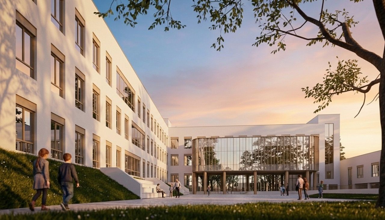 Школу разместят в левом крыле и центральном блоке. Она будет рассчитана на 500 учащихся: 200 детей начальных классов, 250 учеников среднего звена и 50 старшеклассников. Трёхэтажный блок будет состоять из учебных классов и лабораторий, библиотечно-информационного центра, мастерских, кабинетов логопеда и психолога, спортзала, столовой и зрительного зала на 270 мест.