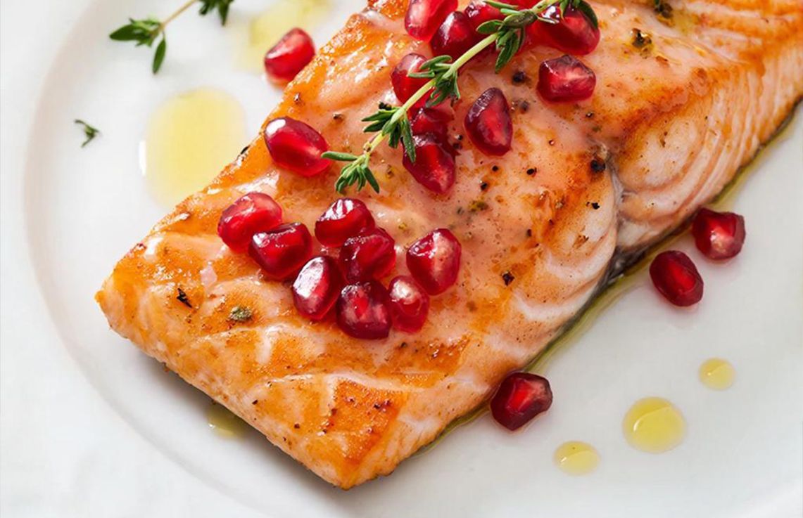Дайте лососю отдохнуть пару минут и нарежьте на порции. Полейте гранатовым соусом и сразу подавайте с салатом или рисом.