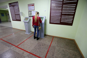 В четвёртой поликлинике при входе никто пациентов с термометром не встречает, в общий холл посетители заходят без измерения температуры. В отличие от третьей поликлиники в четвёртой мы не увидели даже намёка на стол, где могли бы располагаться средства защиты для пациентов. Спрашиваем медрегистратора, где можно взять маску для пациента. В ответ полный недоумения взгляд: «Если они в аптеках закончились, откуда же они у нас, тем более для пациентов?»