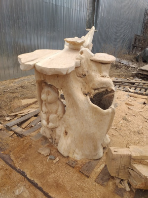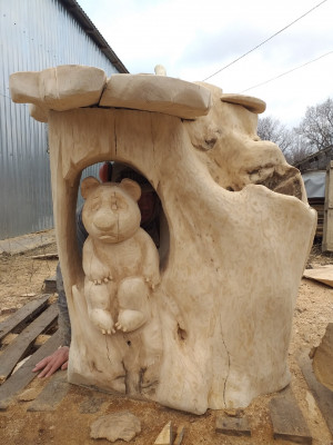 Скульптура медведя выглядит очень реалистичной: выпилены все мелкие детали зверя, даже глаза, брови и когти. Так же и у самой столешницы — дупло, в котором сидит мишка, — сделаны все неровности древесной коры.
