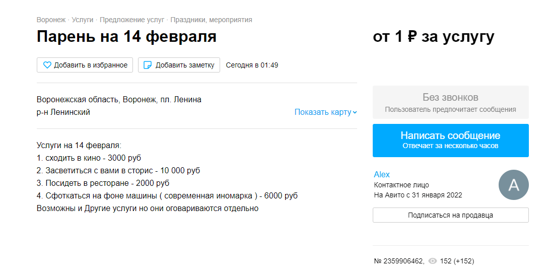 Судя по всему, молодой человек ждал праздника, чтобы подзаработать, так как на сайте он зарегистрировался в конце января этого года. Больше объявлений в его профиле нет. Возможно, после 14 февраля в аккаунте воронежца появятся восторженные отзывы девушек, успевших воспользоваться его услугами.