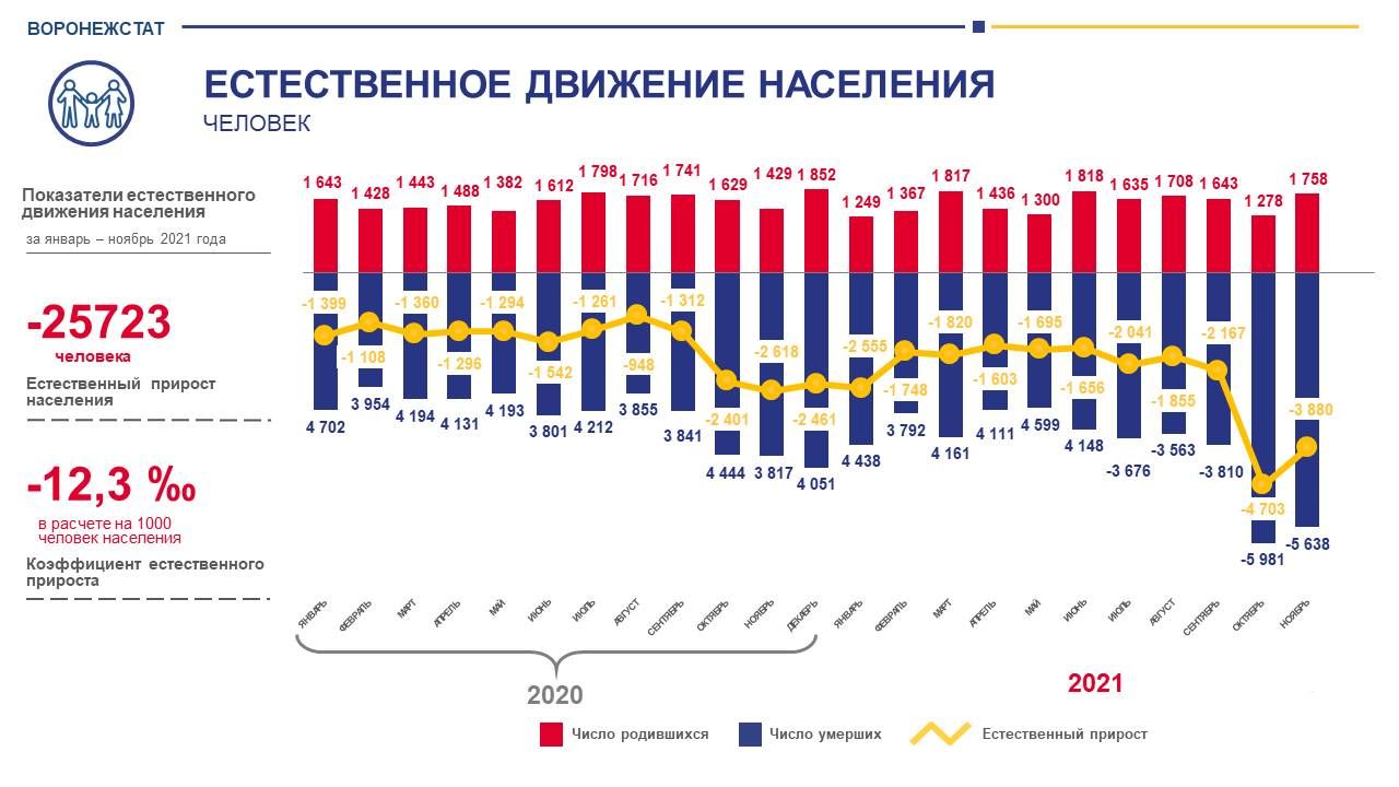 По данным ведомства, коэффициент естественного прироста в регионе ушёл в отрицательные значения — минус 12,2% в расчёте на 1 000 человек населения. Подробную информацию по рождаемости и смертности можно посмотреть на инфографике от Воронежстата.