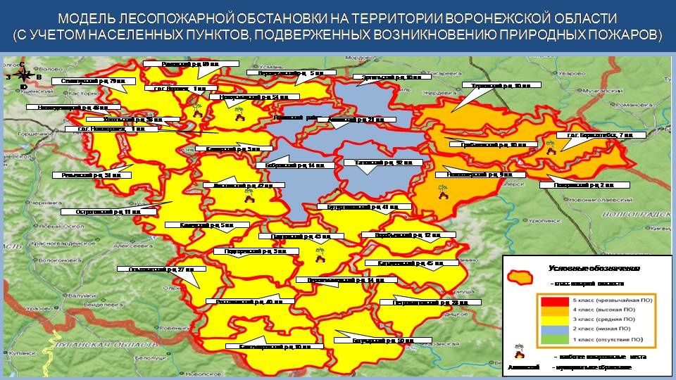 IV класс пожарной опасности (высокую степень) установили в Борисоглебске, а также в Грибановском, Терновском, Поворинском и Новохопёрском районах. Пожары там могут появляться даже от незначительных источников, быстро распространяться и создавать дополнительные мелкие очаги.