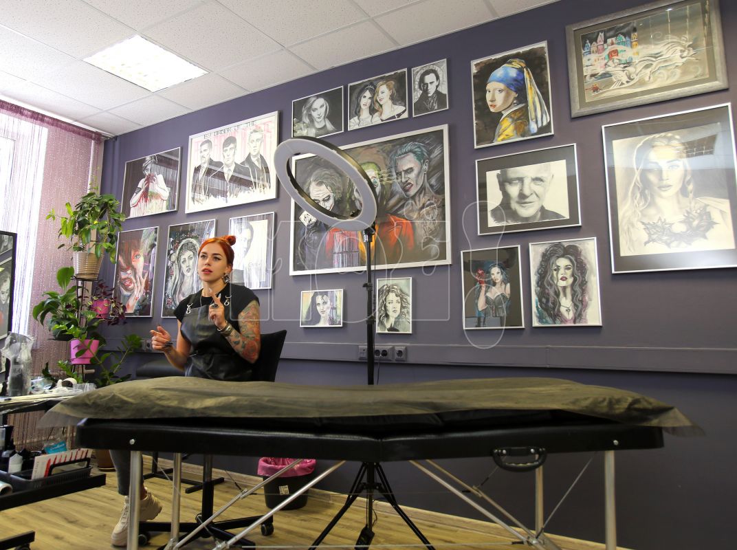 В центре стены — портрет Джокера из фильма «Отряд самоубийц», внушительных размеров и очень яркий. Рядом персонажи из «Игры престолов», актёр Энтони Хопкинс. Казалось, что это чёрно-белая фотография, но нет, на самом деле — рисунок карандашом. Вот рок-музыкант Мэрилин Мэнсон — сходство с живым фантастическое. Все эти рисунки по желанию клиента могут стать татуировкой, которую набьёт Валери. В этой индустрии девушка уже 7 лет, и все эти годы работа ей приносит не только удовольствие, но и неплохой доход.