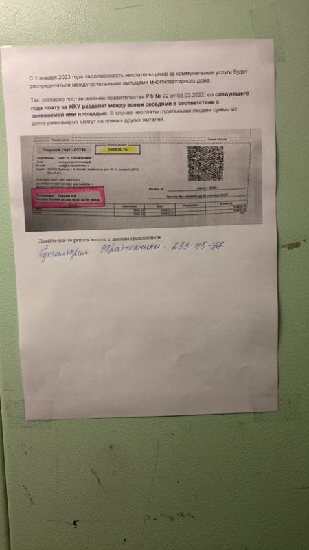 Объявление о том, что «плату за ЖКУ со следующего года разделят между всеми соседями в соответствии с занимаемой ими площадью» появилось в лифте одного из воронежских домов. Также сообщалось, что «в случае неоплаты отдельными лицами их долга, плата равномерно ляжет на плечи других жителей».