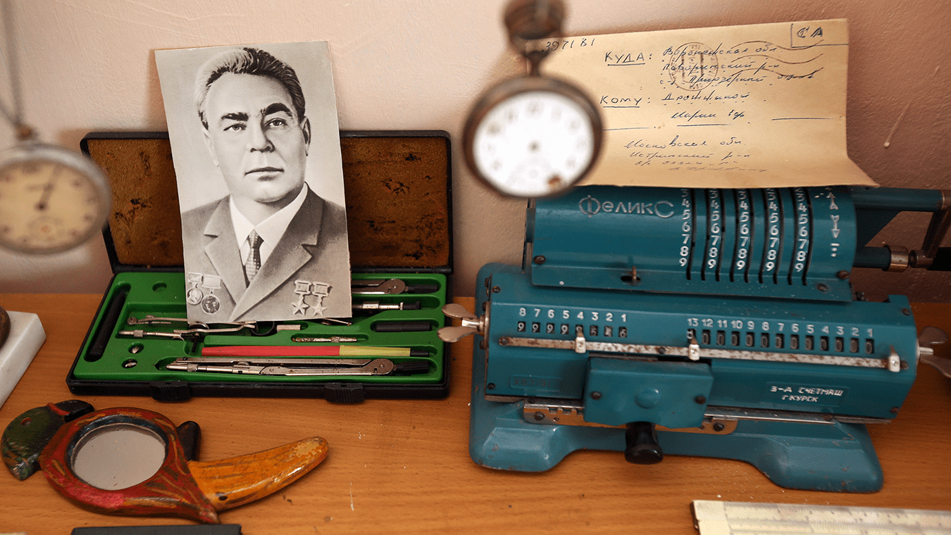 Ну а если брать по мелочам, то в экспозиции дачного музей есть и чернильница-невыливалка, какими школьники пользовались вплоть до 1970-х годов, и резная хлебница ручной работы производства 1950 — 1960-х годов, и многочисленные вымпелы с мест работы «директора» музея. А ещё портрет Сталина на стене. Вождь грозно посматривает на экспонаты коллекции воронежского пенсионера и на Ильича, чей профиль присутствует на одном из настенных вымпелов...