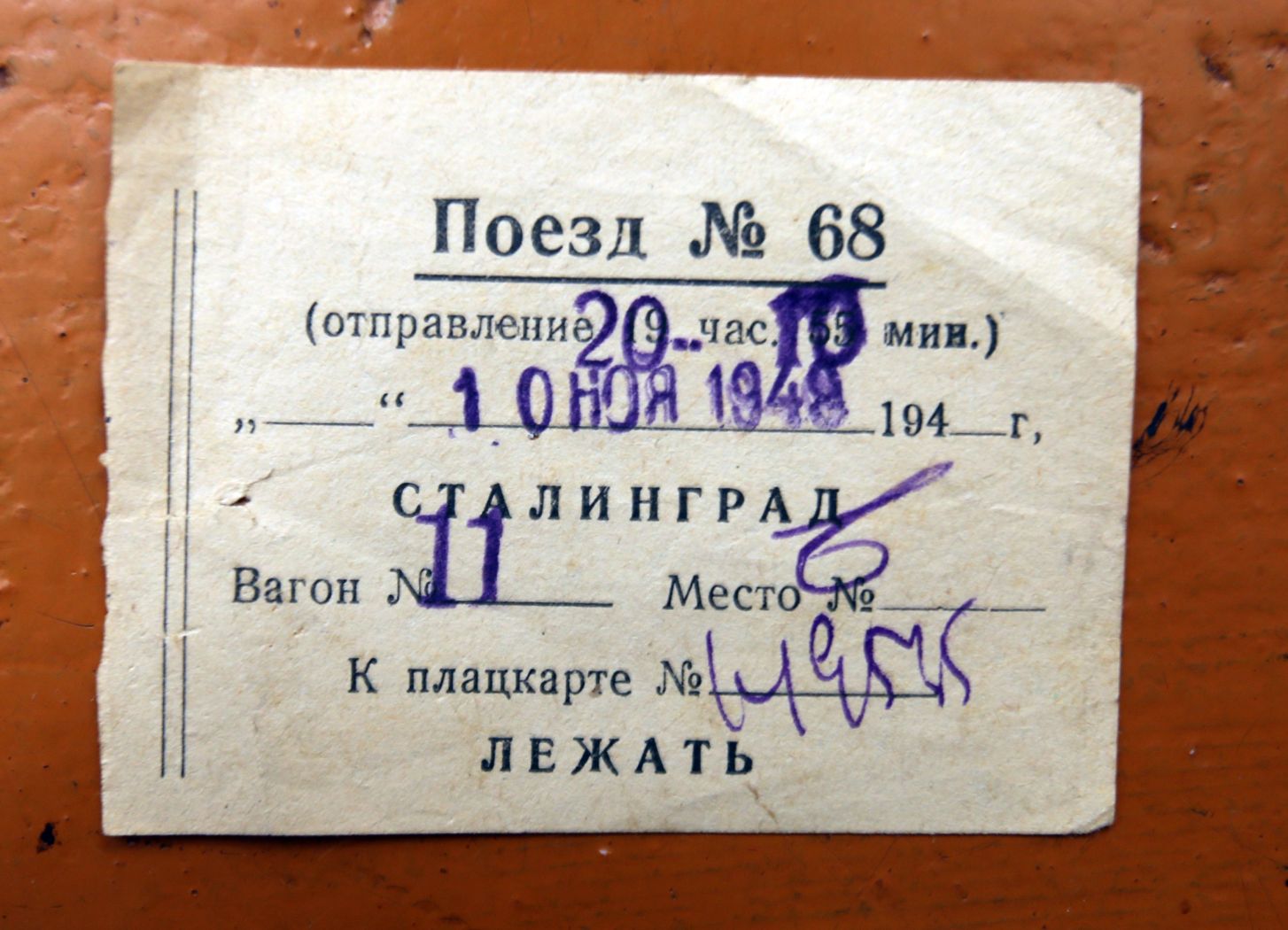 Документы деда нашего героя, умершего в середине 1980-х, все так или иначе связаны или с войной, или с послевоенными временами. Здесь и отсрочка от мобилизации от 31 декабря 1944 года, и временный пропуск на работу от 3 сентября 1945 года, и билет на поезд № 68 до Сталинграда, датированный 10 ноября 1948 года. Дед работал в 23-м стройуправлении строителем-разнорабочим 3-го разряда.