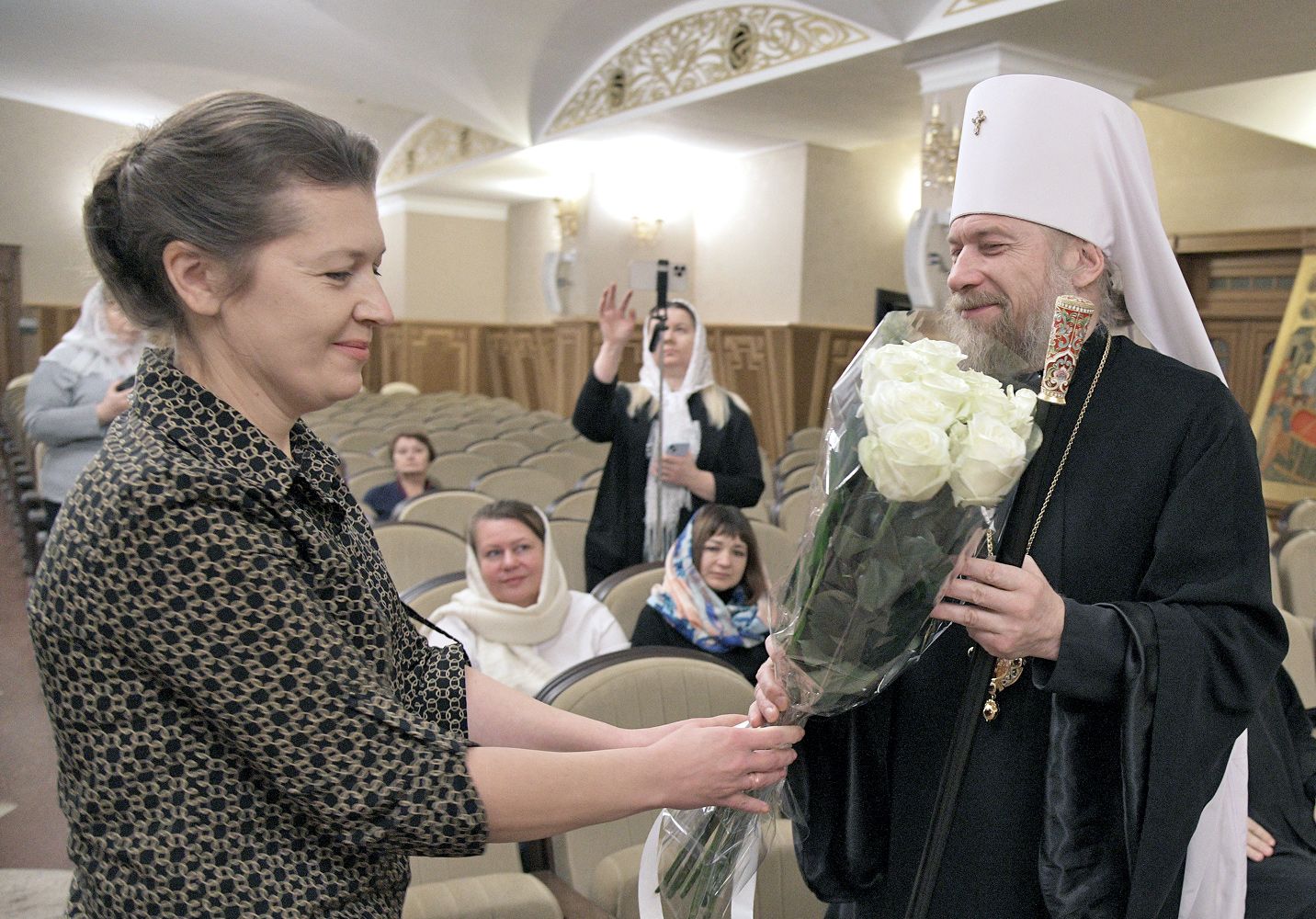 Ведущая рубрики «Православная неделя» Мария Елисеева вручила митрополиту букет белых цветов.