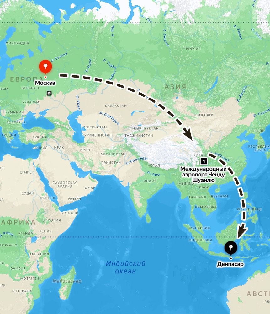 Героиня нашей публикации преодолела в общей сложности около 11 тысяч километров по воздуху — от Москвы до Ченду порядка 6 тысяч км, от Ченду до Денпасара — более 4,5 тысячи.
