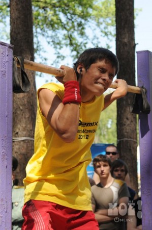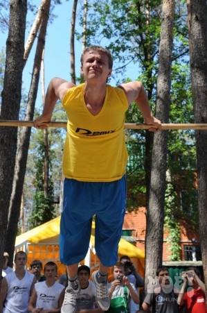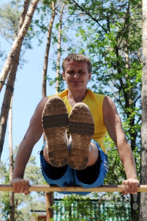 Олег Гребенников. Немного размявшись, парень с лёгкостью запрыгнул на турник и в