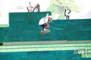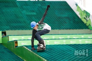 Для прыжков на площади была сооружена горка высотой в 6 метров с различными трамплинами. Вместо снега использовалось специальное покрытие, которое представляет собой ячейки их пластмассовых щёток. Лыжи и сноуборды по нему замечательно ехали. Покрытие не очень крепкое, и после неудачных падений спортсменов отрывались целые секции. Но, благо, на склон выходили техники и быстро его восстанавливали.
