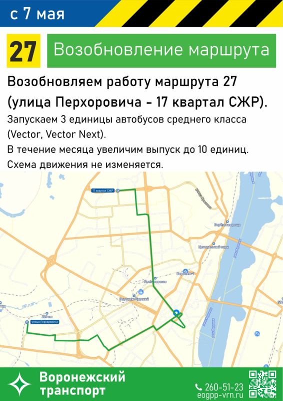 Автобусный маршрут № 27 (улица Генерала Перхоровича — 17-й квартал Северного жилого района (остановка «Школа») вновь появится на воронежских улицах со вторника, 7 мая. Об этом сообщили в городском управлении транспорта.
