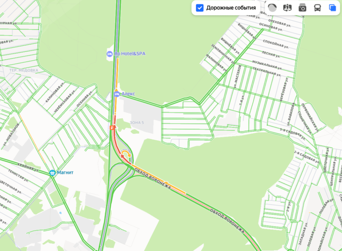 Пробка собирается на трассе «Обход города Воронежа» в сторону Москвы, если верить данным сервиса «Яндекс карты».