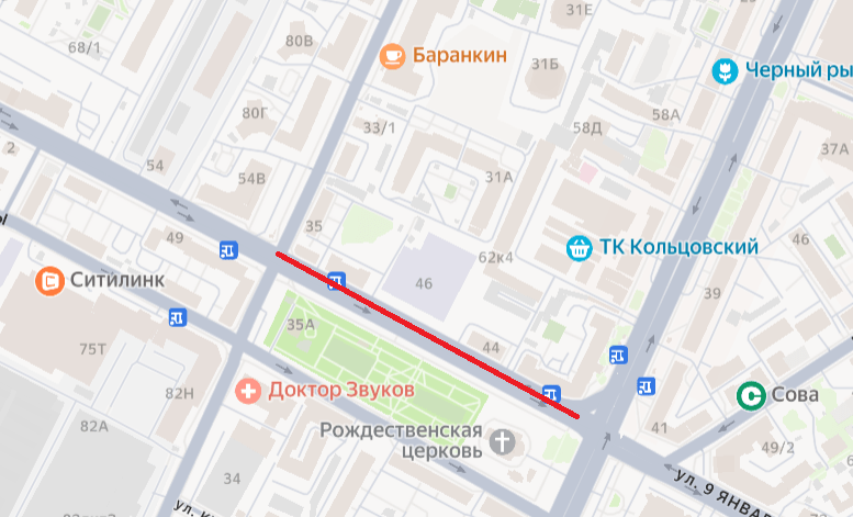 — № 61 с ул. 9 Января по улицам Кольцовской, Плехановской, Донбасской, 9 Января и далее по маршруту. В обратном направлении — с улицы 9 Января по улицам Донбасской, Плехановской и далее по маршруту.