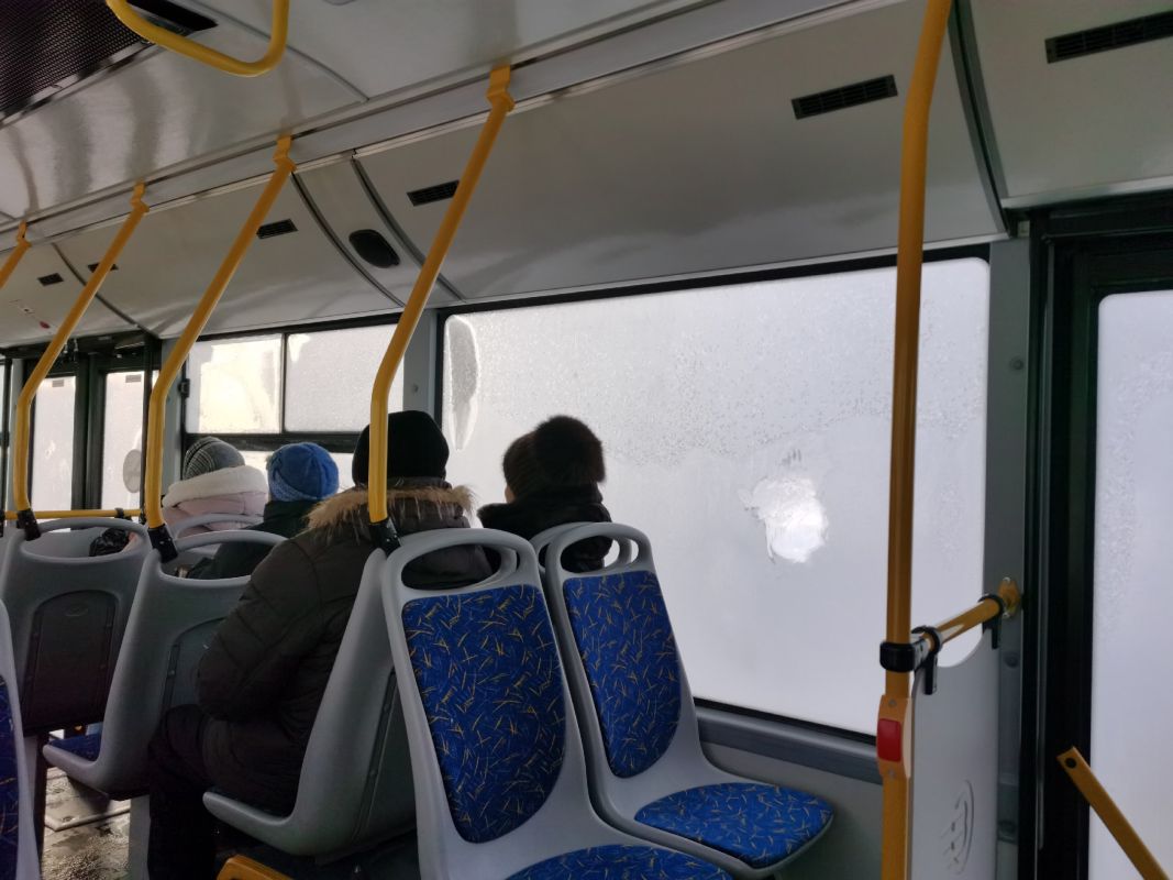 Помочь угадать пассажирам остановку помогают лишь небольшие оттаявшие участки на стёклах, но и то с большим трудом. К счастью, хотя бы у водителя обзор был чистый.