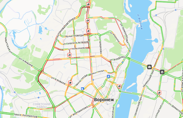 9 баллов достигли пробки в Воронеже утром понедельника, 16 февраля. Заторы отмечены красным на интерактивной карте.