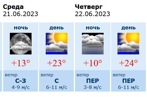 В ночь на четверг, 22 июня, похолодает до +12...+14 градусов, скорость северо-западного ветра — 4 — 9 м/с.