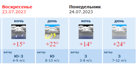 В ночь на понедельник, 24 июля похолодает до +14-16 градусов, ожидается кратковременный дождь. Скорость ветра 4-9 м/с.