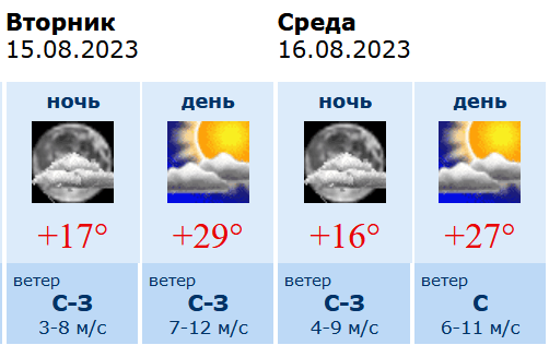 В ночь на среду, 16 августа, столбики термометров опустятся до +16 — 18°, скорость ветра 3 — 8 м/с.