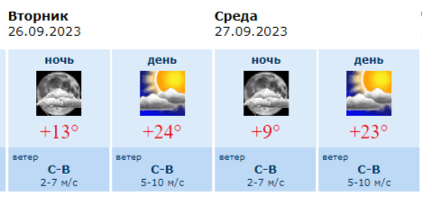 В ночь на среду, 27 сентября, температура снизится до +12...+14°, скорость ветра 2 — 7 м/с.