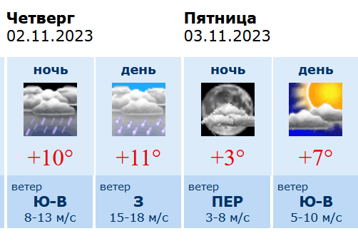 Погода будет облачной с прояснениями, ожидается дождь. Скорость западного ветра 8 — 13 м/с с порывами до 15 — 18 м/с.