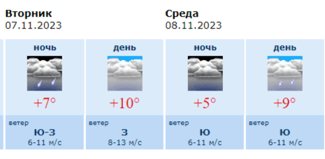 В ночь на среду, 8 ноября, пройдёт небольшой дождь, температура воздуха составит +6 — 8°. Скорость юго-западного ветра 6 — 11 м/с.