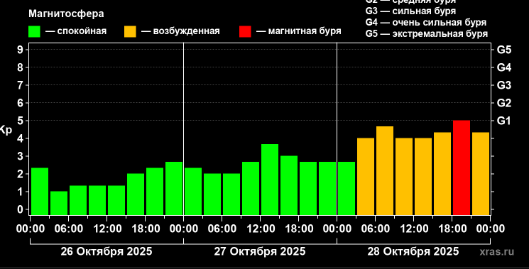 Сложная геомагнитная обстановка сохранится до четверга, 30 октября.