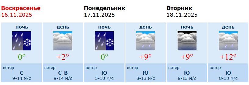 Ночью в воскресенье, 16 ноября, похолодает до 0°. Также ожидается мокрый снег с дождём. Синоптики отмечают, что сугробов ждать не стоит — снежинки будут сразу таять.
