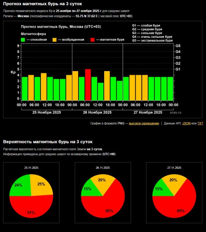 Пик магнитной бури ожидается завтра, 26 ноября, с 6:00 до 9:00. Возможны геомагнитные возмущения силой G1.