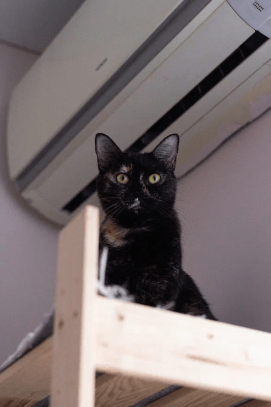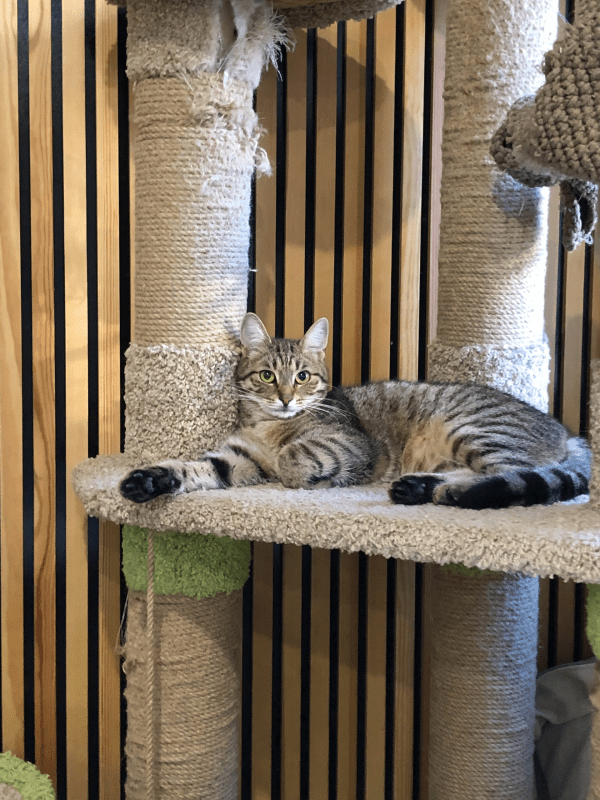 Она всегда на высоте — то на игровом комплексе сидит, то в кошачьей комнате на верхней полке за всеми наблюдает. Быть может, она смотрящая?