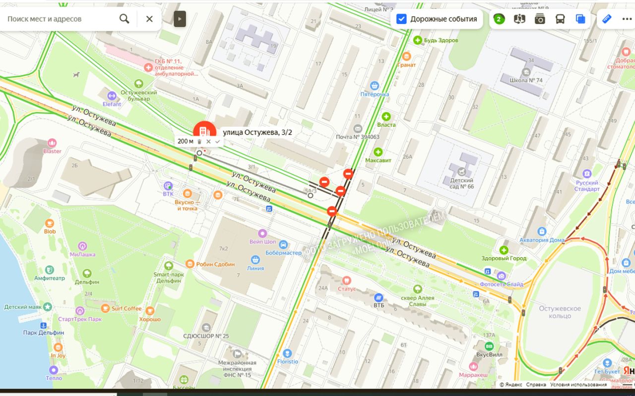 Управление дорожного хозяйства г. Воронеж сообщило, что перекроют участок улицы от дома № 5А/3 до дома № 3/2 ул. Остужева в связи с переустройством теплосетей. Но по факту дом №3/2 ул. Остужева это бывший павильон «Родные просторы», который находился на расстоянии 200 метров от ремонтных работ и его ранее снесли, статья от 04.08 2024 «Имеется крыша и не сносят павильон». https://moe-online.ru/nn/ncontrol/616540