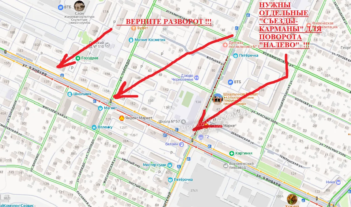 Возвращаясь к старым проблемам, вопрос со знакам и разметкой на перекрестках ул. Торпедо и ост. Пивзавод также не решен, а именно: на пересечении с ул. Торпедо по сути осталась одна полоса для движения «прямо», т.к с левой полосы автомобили поворачивают и разворачиваются (развороты ведь все убрали!). Такая же ситуация на пересечении с ул. Машиностроителей (ост. Пивзавод) - одна полоса для движения прямо, т.к с левой ТОЛЬКО поворот налево и разворот. Для улицы с высоким трафиком движения это катастрофически мало! В утреннее и вечернее время люди вынуждены по 1,5 часа стоять в пробках. При движении с ул. Проспект Труда - аналогичная ситуация - одна полоса для движения «прямо», с левой полосы разрешен только поворот налево или разворот.