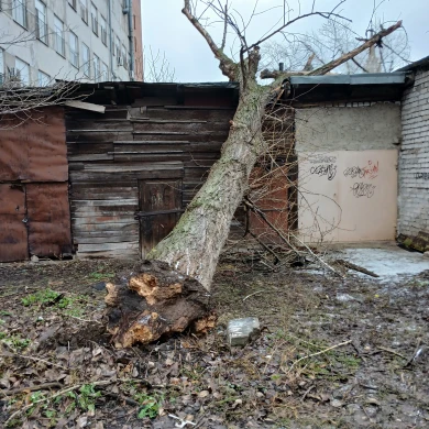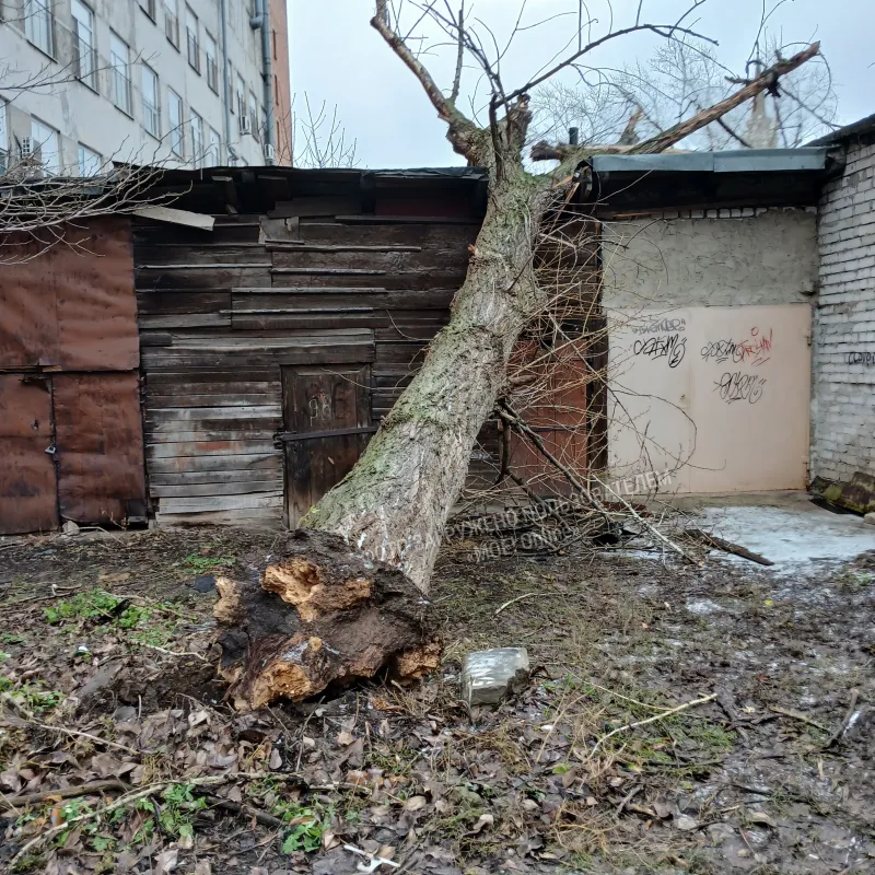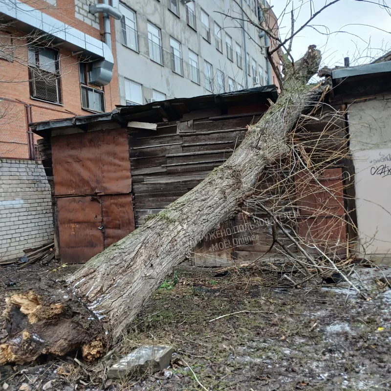 Ещё одно дерево упало во время разгула ветра в Воронеже на сараи на против дома хорошо что не на проезжую часть улице Красноармейской 33/ 6, вырвала с корнем