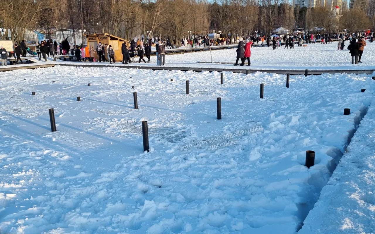 На дворе февраль 2026 год, а акватория бассейна выглядит совершенно по другому, в дно бассейна вбиты трубы, торчащие над льдом водохранилища.