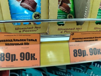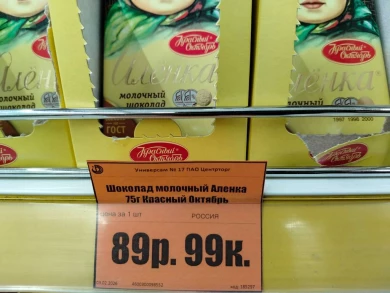 А тут мне повезло! - И торговая марка известная - «Алёнка» - и цена отличная - 89 руб 99 коп. Надо ли говорить, что рука сама потянулась. И схватила уж было плитку… И тут - на тебе! - удар под дых: цена-то и впрямь 89.99. Но вес-то плитки - вместо ста традиционных граммов - несчастные 75!