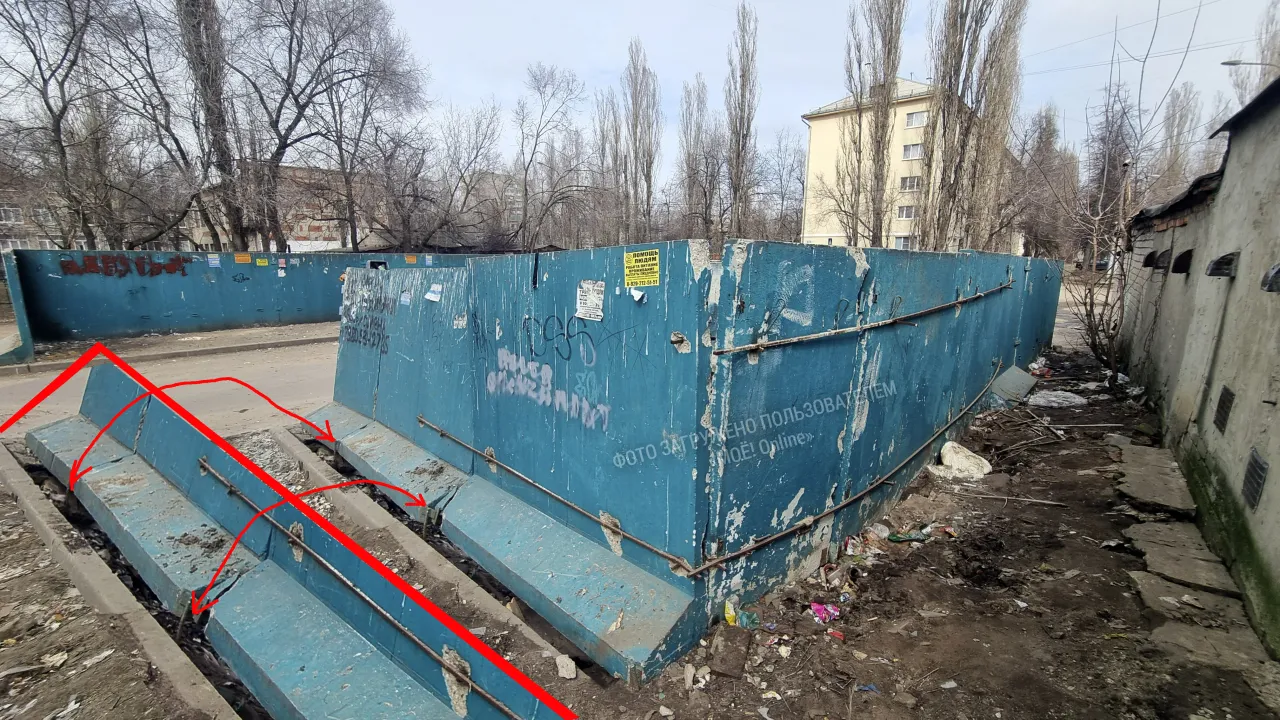 Сзади забора в два ряда укрепили арматурой бетонные плиты. Но от этой инженерной мысли легче не стало - имеется большой зазор между основанием и забором.