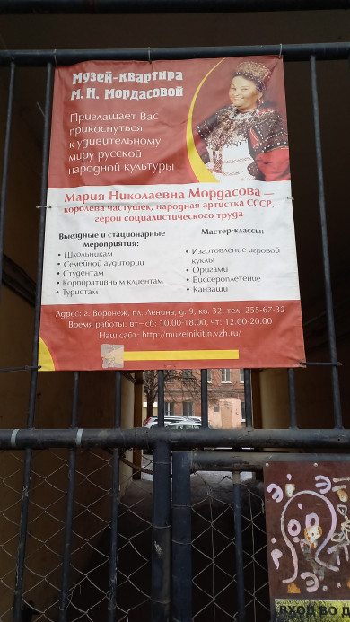Музей-квартира Марии Мордасовой открыт аж с 2005 года, но даже коренные воронежцы об этом не знают, настолько невыразительна эта вывеска на ржавом заборе у Кольцовского сквера ( между аркой и бывшим 4-ым универмагом). Все звонки у калитки с кодовым замком оказались поломаны.