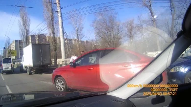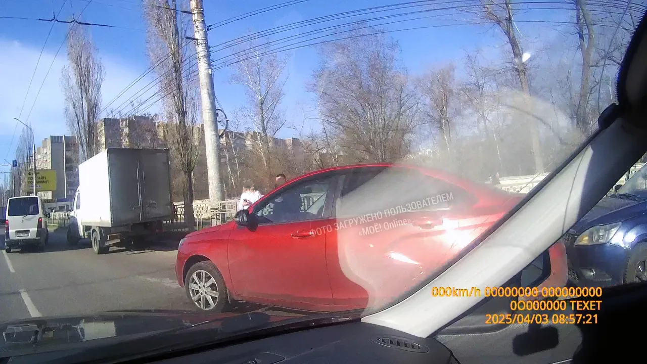 Видимо что то пошло не так у водителя красного авто, а сзади ехавший форд влетел в её авто. Следом ехавший "Соболь" тоже встал.