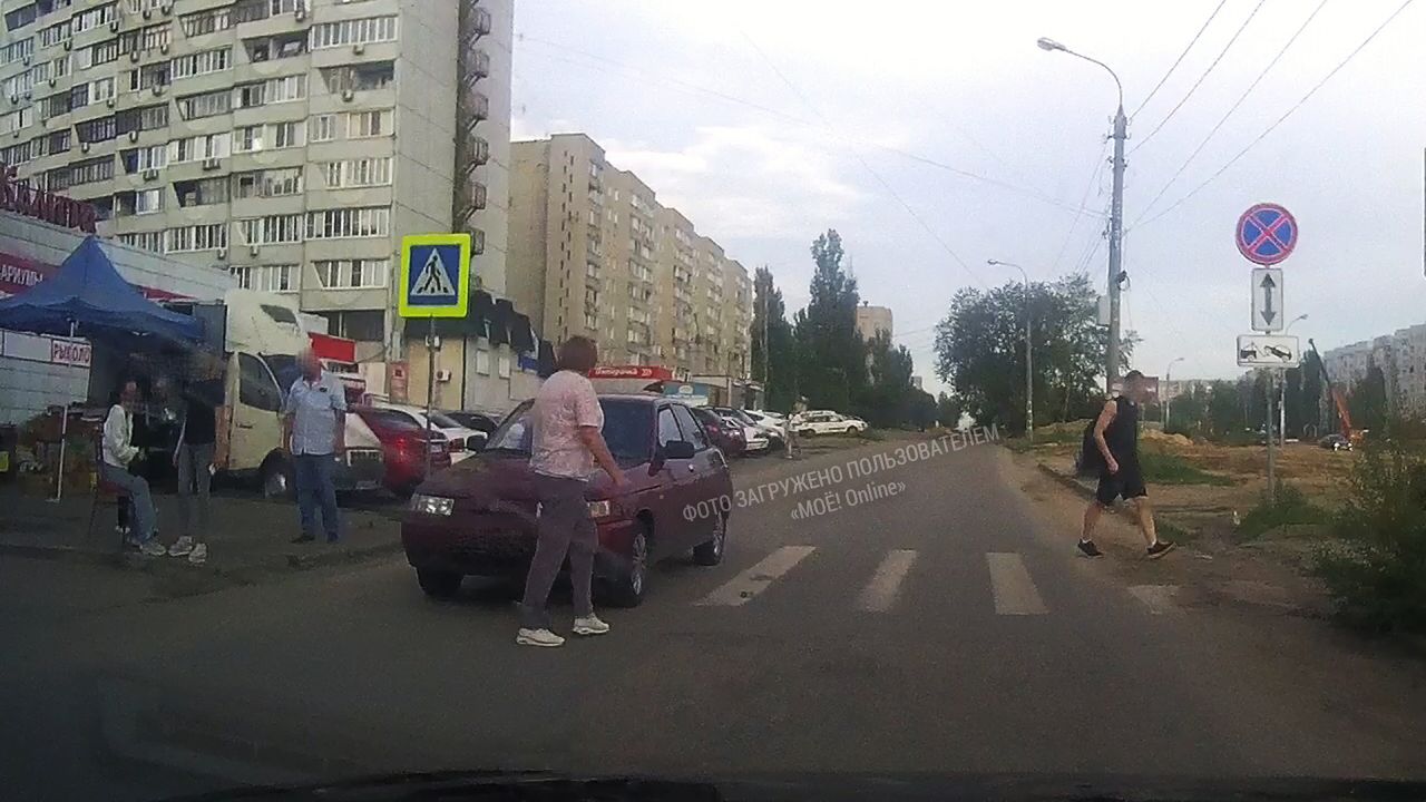 Пострадавшая девушка в ДТП сидела на стуле около перехода. Девушка переходила дорогу и на неё наехала красная десятка. После ДТП десятка остановилась на переходе.