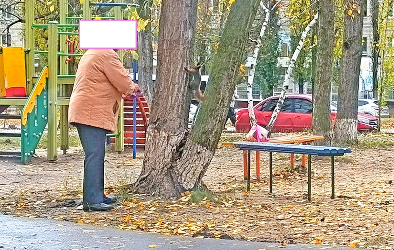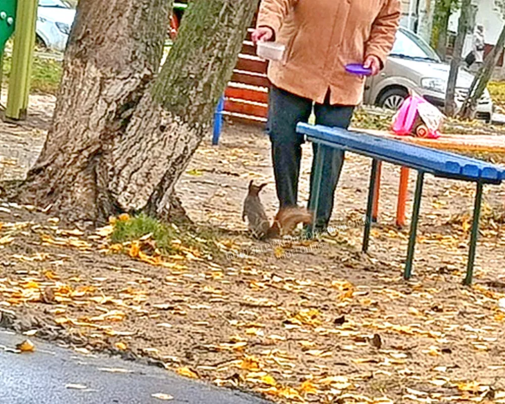 И снова))) И так каждый день.. Белочка пришла))) В один из дворов нашего города..в одно и то же время в гости приходит белочка..И одна из женщин ( жительница дома) выходит покормить её)))