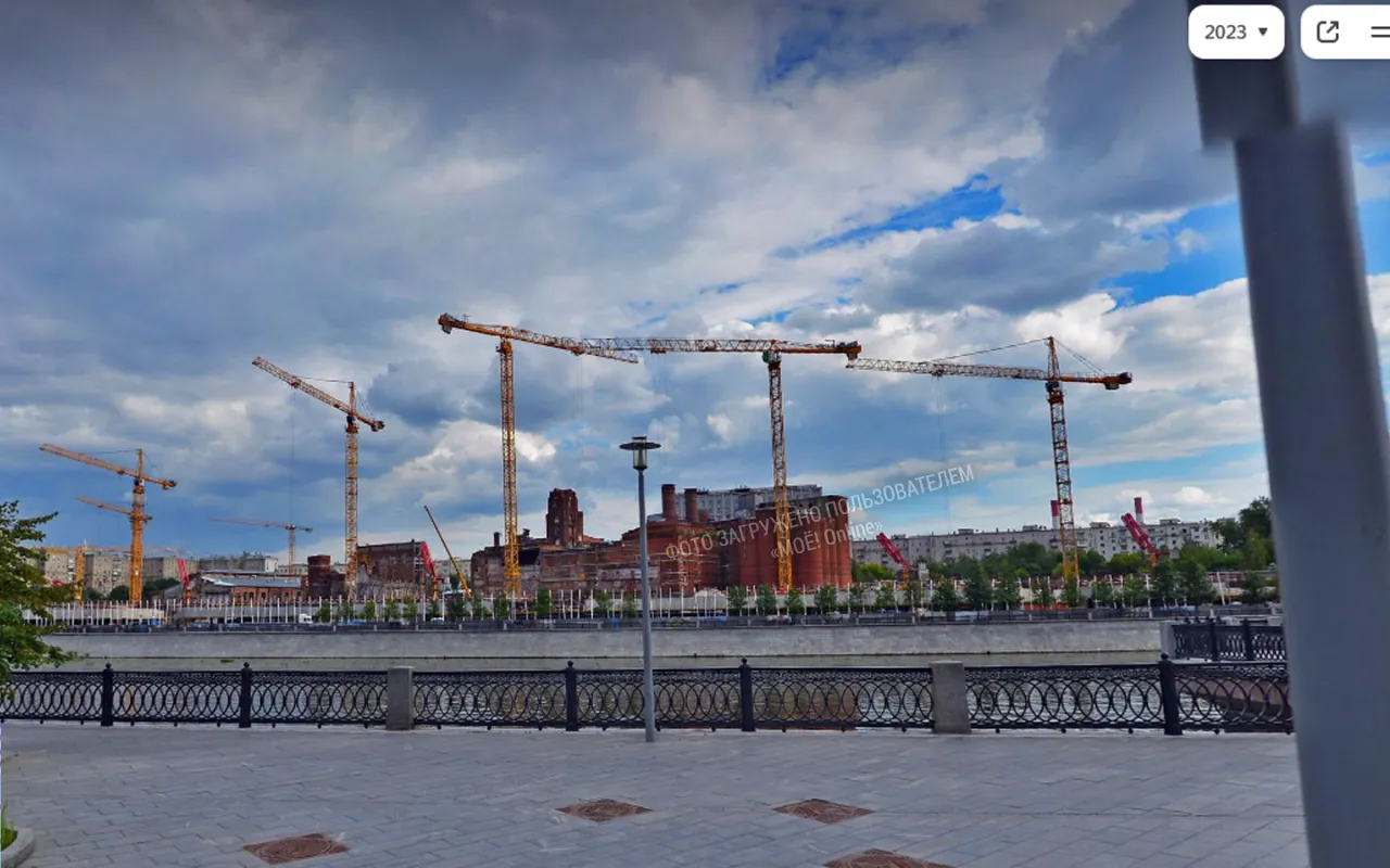 Через возведённые колонны виден исторический завод, со стороны реки Москвы.