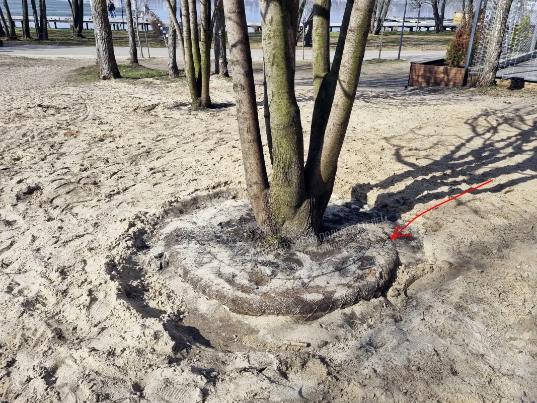 Вокруг корня дерева, просел песок после таяния снега, обнажив мешковину с металической проволокой. Так какой же возраст, пересаженных деревьев?