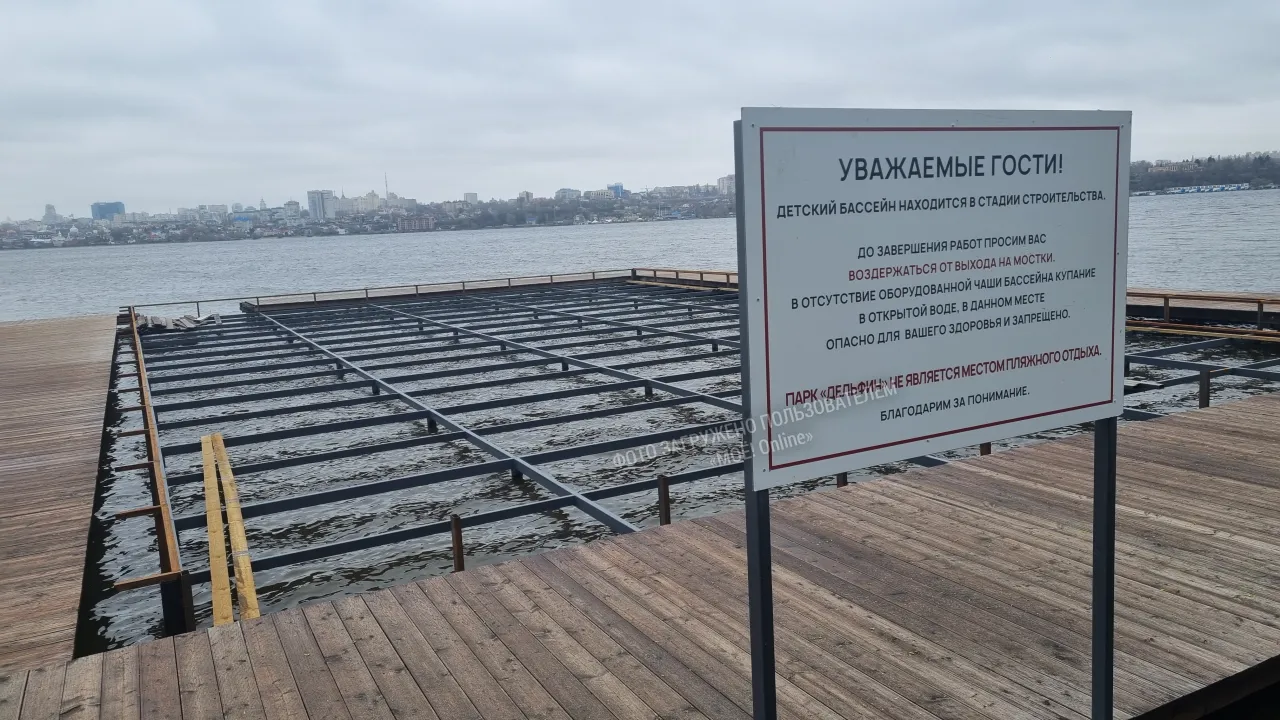 В парке "Дельфин" продолжают проводиться работы по благоустройству територии. Зимой в зону будущего бассейна на акватории водохранилища забили сваи.