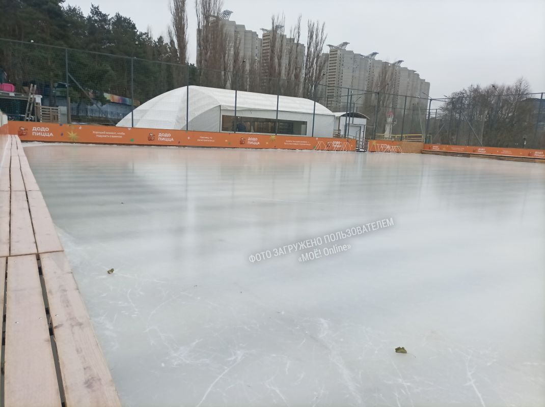 Все многокилометровые трубы с хладагентом уже залиты водой. А на льду первые следы от коньков: испытание выдержал лёд, перед входом устанавливают табличку с графиком работы.