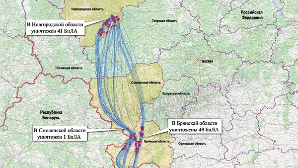 На рисунке - карта атаки боевых украинских БПЛА на резиденцию президента России, предоставленная Министерством обороны РФ.