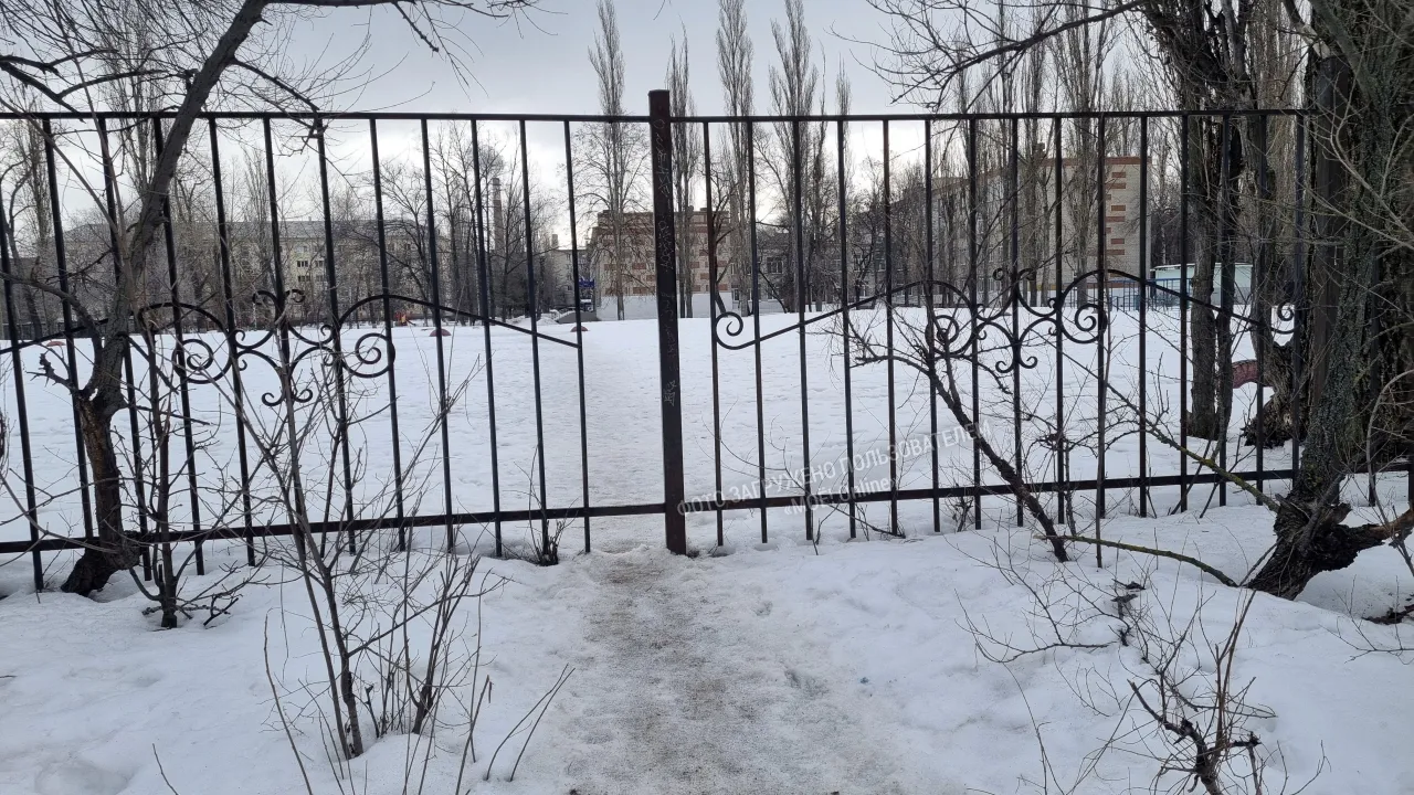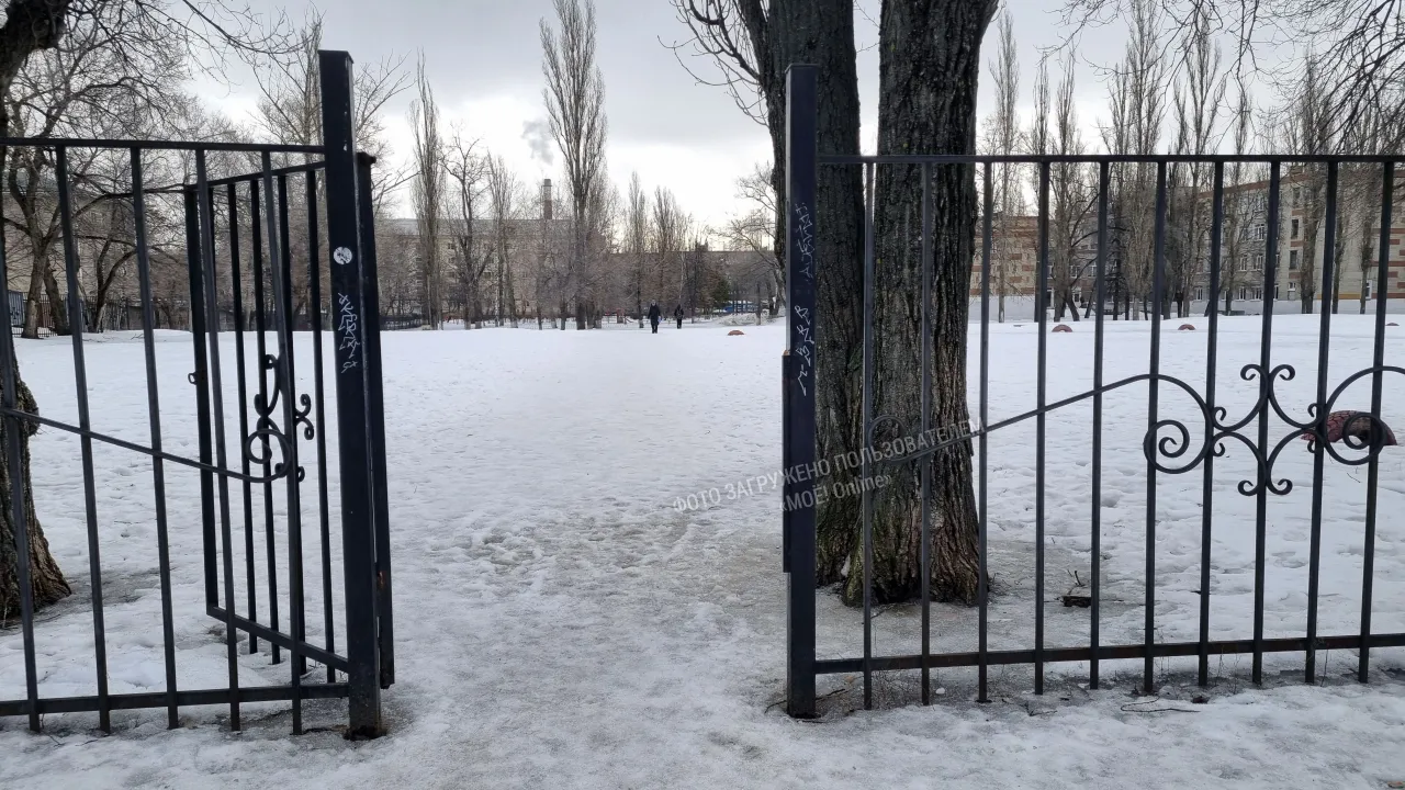 Забор вокруг территории другой школы сделан из металлической трубы. Так в нём просто выломали два вертикальных стержня. Кто постарался - то ли любители выгула собак, то ли жители для сокращения пути?