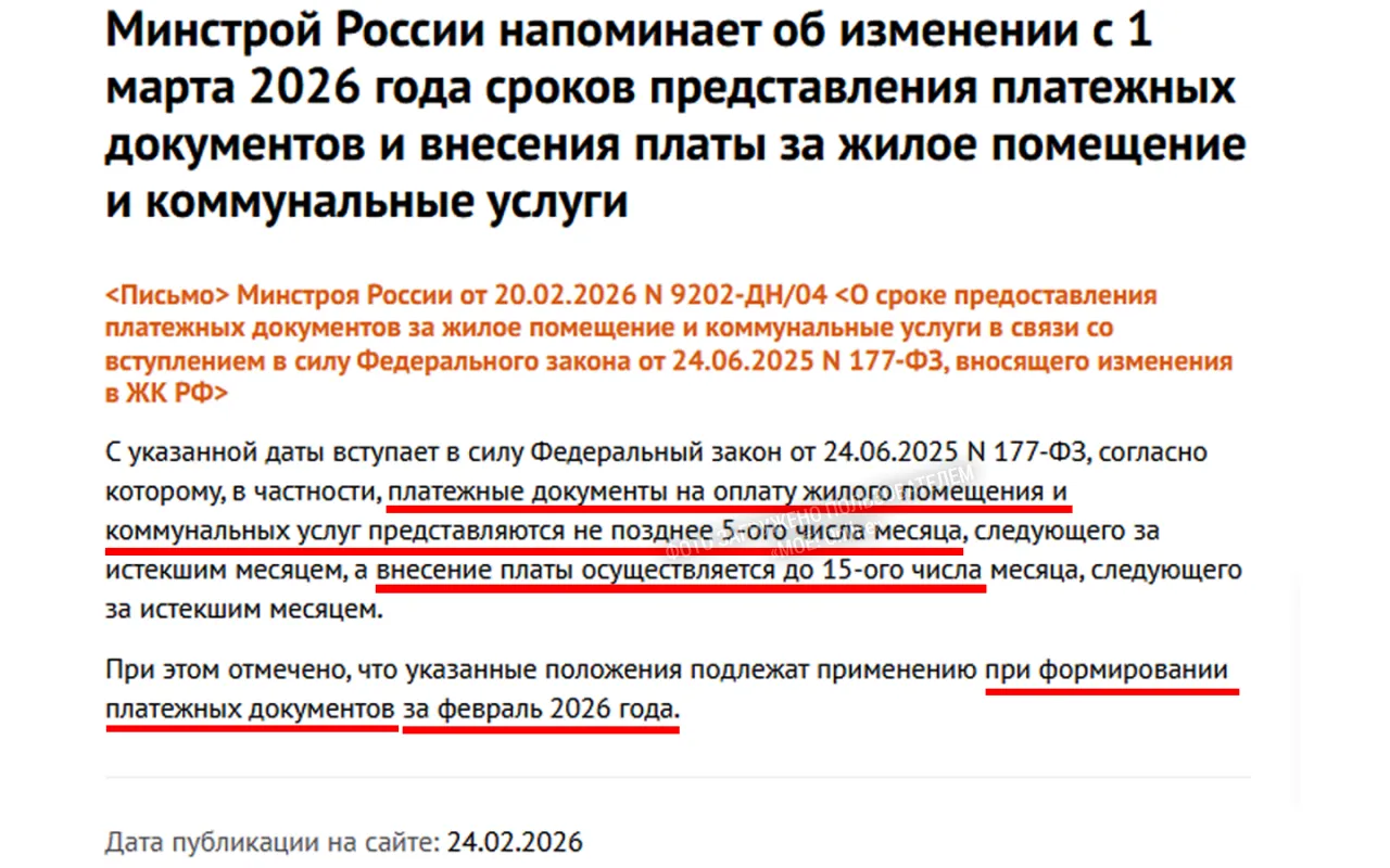 А завтра уже шестое число. Даже это письмо от Минстроя напомнило 24.02.2026г. о том что вступил с изменениями ФЗ от 24.06.2025г. № 177- ФЗ.