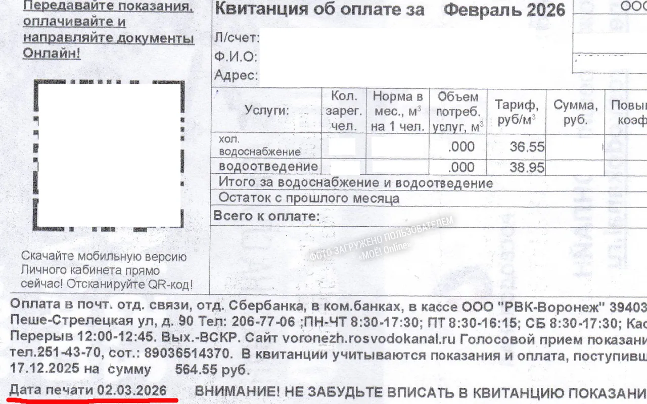 Затем большой перерерыв и в нарушение закона 11.03.2026г. пришла бумажная квитанция от РВК. В ней отсутствует напоминание о сроках оплаты. Зато имеется дата печати: 02.03.2026, трёх дней не хватило разнести квитанции до 5.03.2026г.