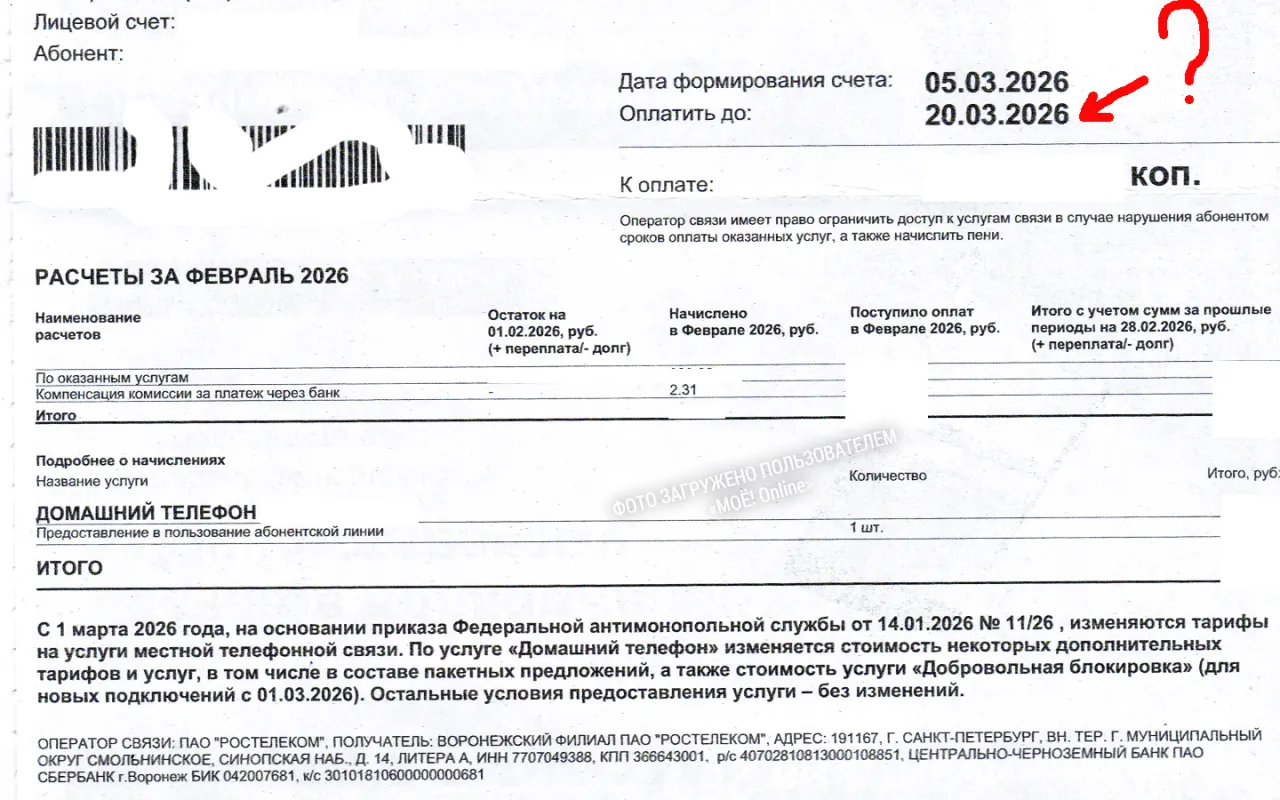 И в заключение бумажная квитанция от Ростелеком. Видимо изменения в законе ЖК РФ не знают. Вам эта информация о чём то скажет, которая в квитанции: Дата формирования счёта: 05.03.2026, оплатить до: 20.03.2026?